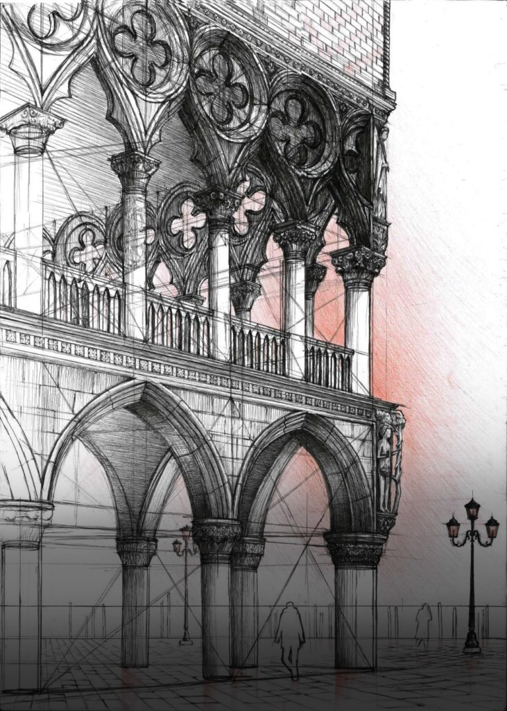 Nauka rysowania architektury historycznej z jej charakterystycznymi detalami, rysunek plenerowy.