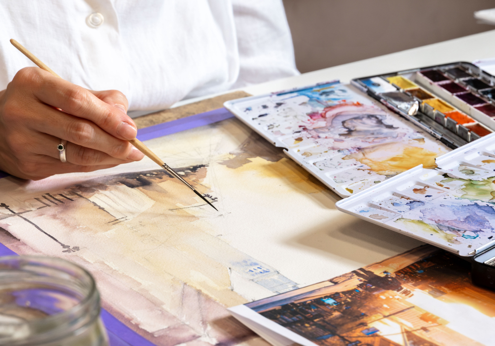 Na kursie malarstwa akwarelowego uczestnicy poznają podstawy pracy z akwarelą, malując m.in. pejzaże, rośliny i weduty.