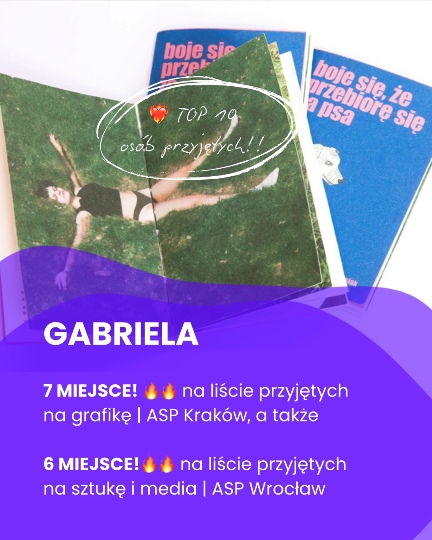 MariaNiesamowicie się rozwinąłem przez rok często intensywnej pracy, co zdecydowanie zawdzięczam prowadzącym, którzy konsekwentnie wkładają dużo wysiłku w pomoc każdej osobie. Super atmosfera wspólnej pracy w pracowni. Polecam każdemu, kto chce rozwinąć swoje skrzydła. Sam dzięki kursowi dostałem się na kierunek sztuka i media! Dziękuję Kasi, Ani i Krzysiowi za motywację do zostania lepszym artystą
